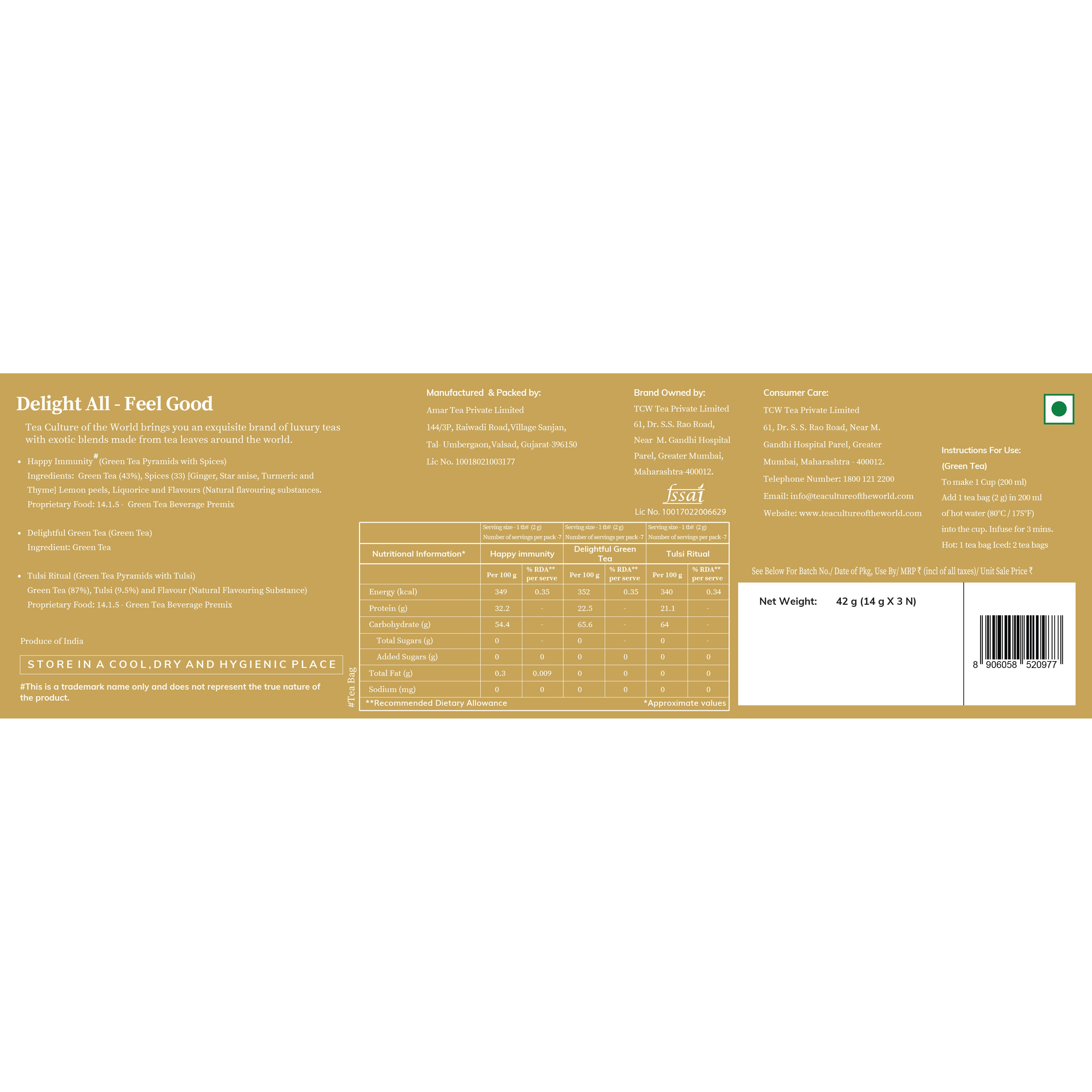 Delight All - Feel Good green tea gift box is your passport to savoring the finest selection of green teas, carefully curated for your indulgence. With 5 unique flavors and a total of 21 tea bags, this elegant gift box is a true delight for the tea connoisseur in you.