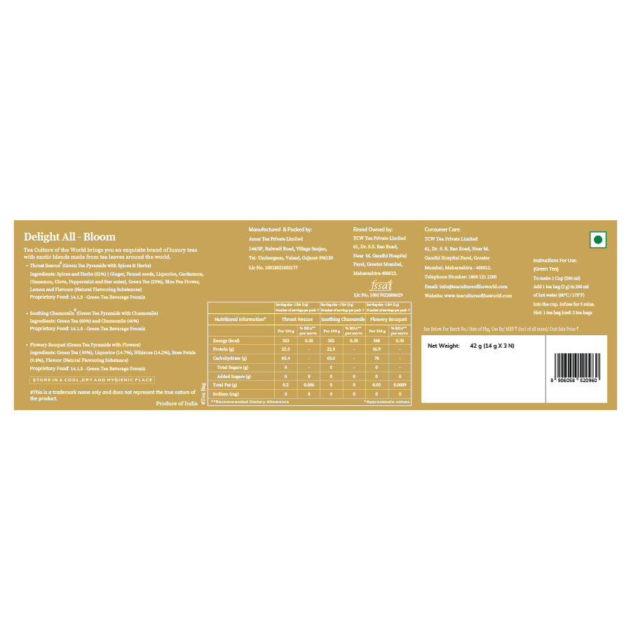 Delight All - Bloom green tea gift box is your passport to savoring the finest selection of green teas, carefully curated for your indulgence. With 5 unique flavors and a total of 21 tea bags, this elegant gift box is a true delight for the tea connoisseur in you.